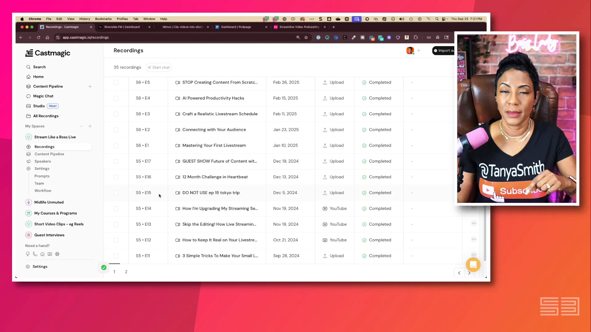 Decide season and episode number. I use a simple naming convention: StreamLikeABoss_s##_e### (e.g., s08_e003). Keep this consistent across Google Drive, Cast Magic, Riverside, Minvo, and PodPage.