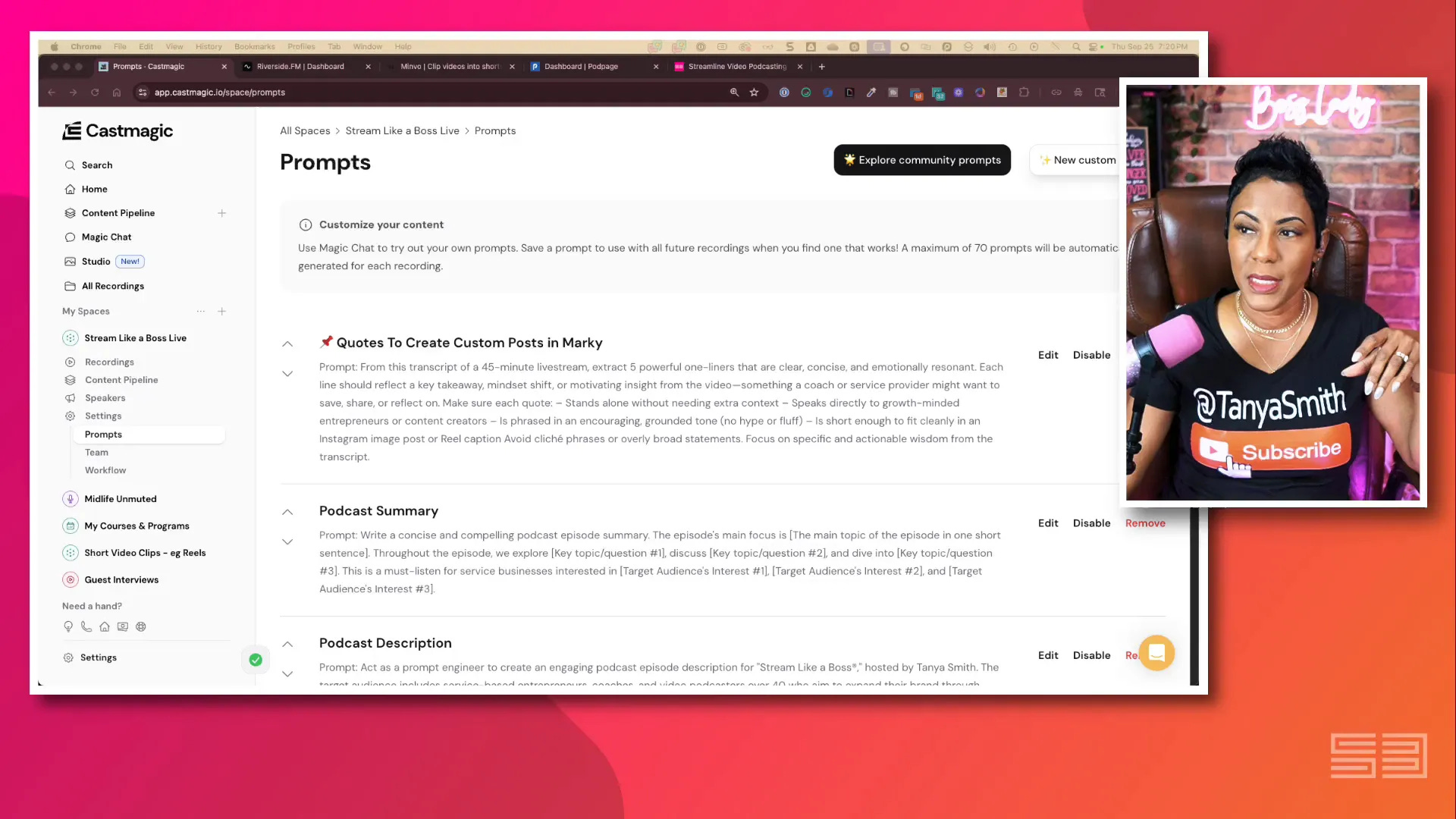 Why I use Castmagic: This is my headless repurposing engine. Castmagic turns a recording into summaries, newsletter drafts, SEO-friendly titles, chapter markers, social post drafts, and more — all based on custom prompts that I set up once and reuse for every episode.